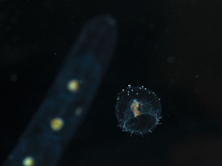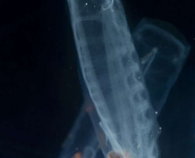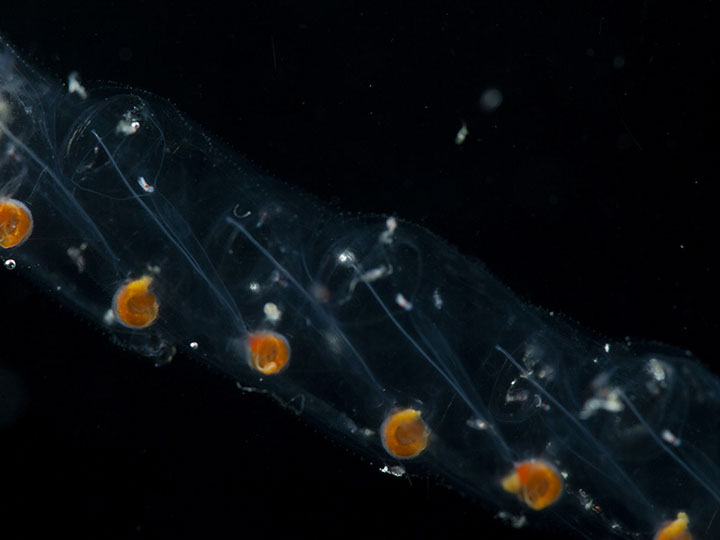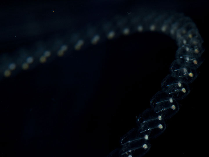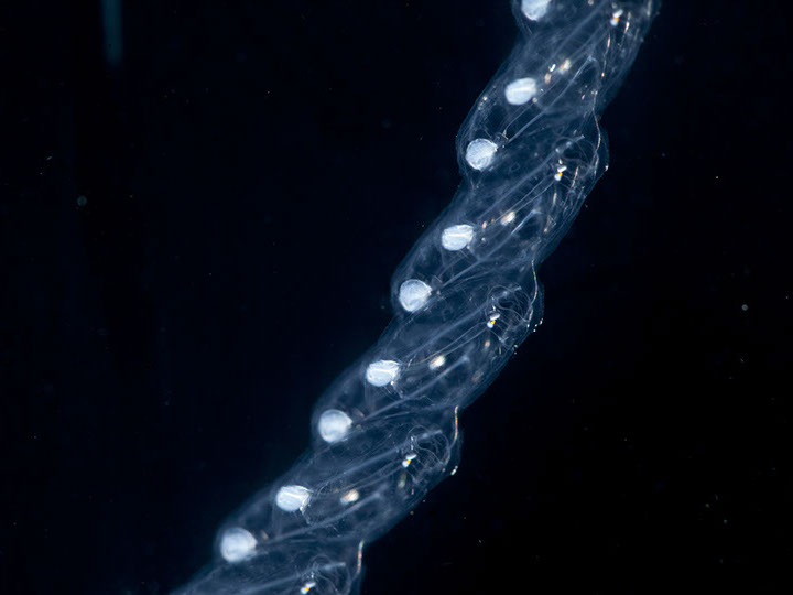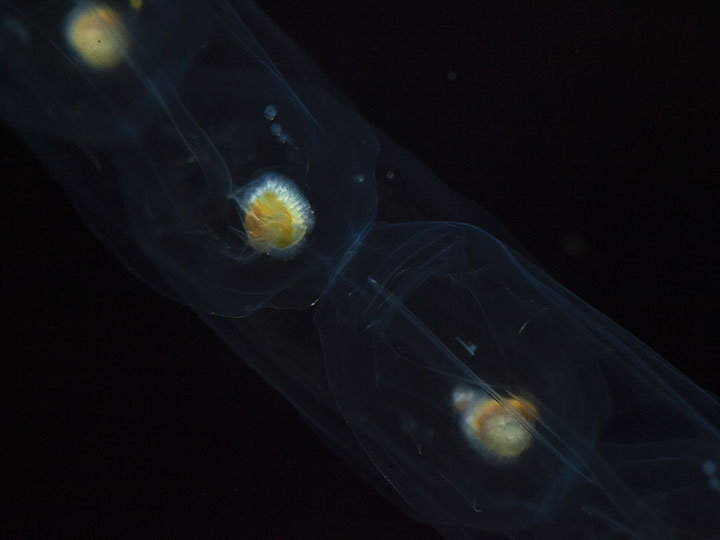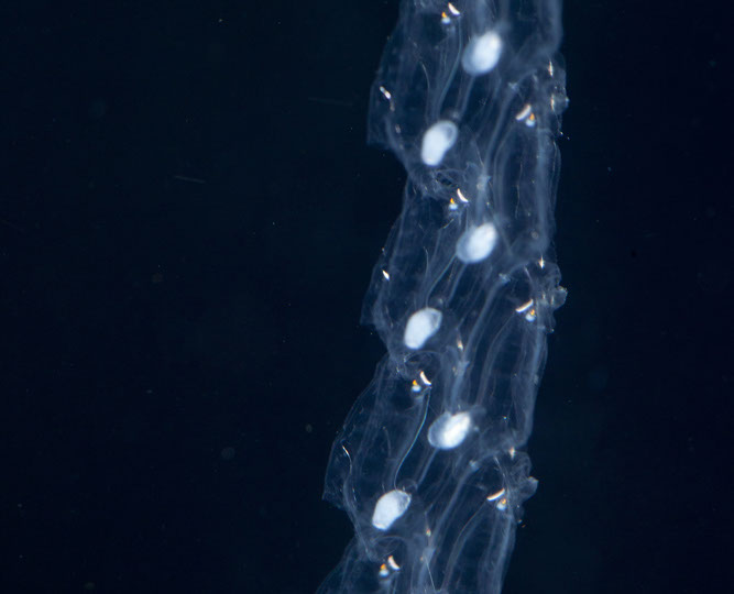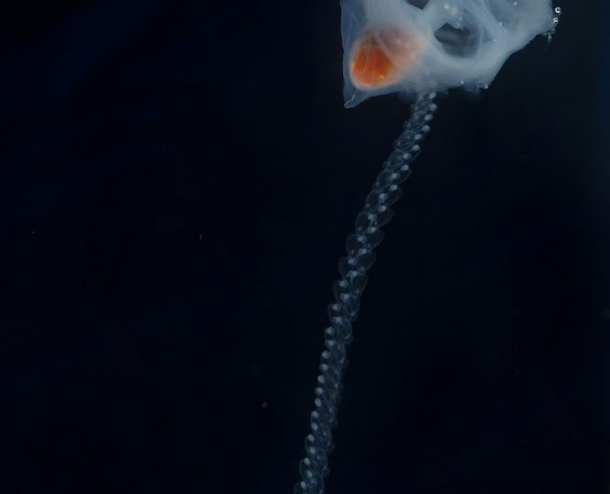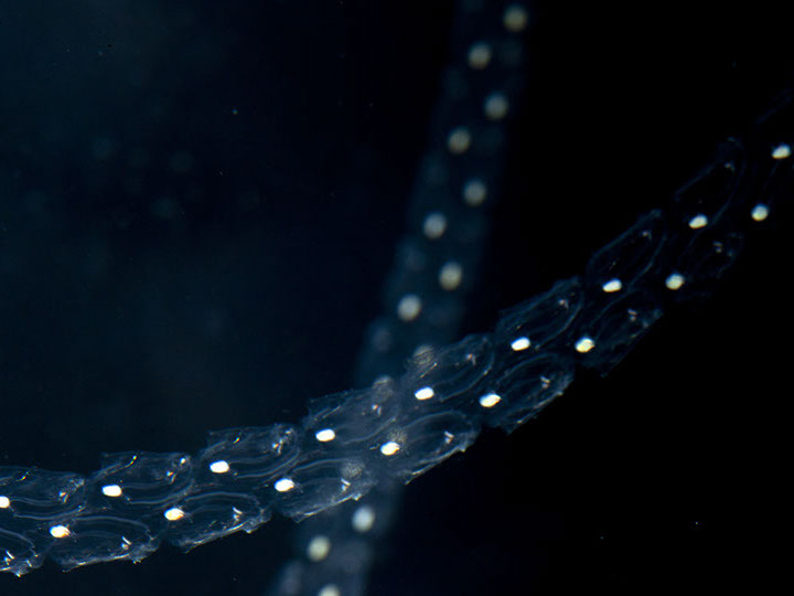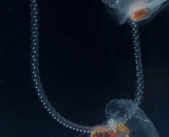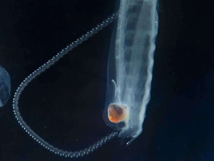 Salpa thompsoni oozooid (foreground) and chain of young S. thomsponi blastozooids (background)