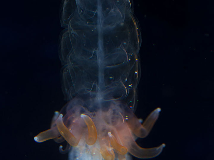 Closeup of Salpa thompsoni oozooid releasing a chain of blastozooids